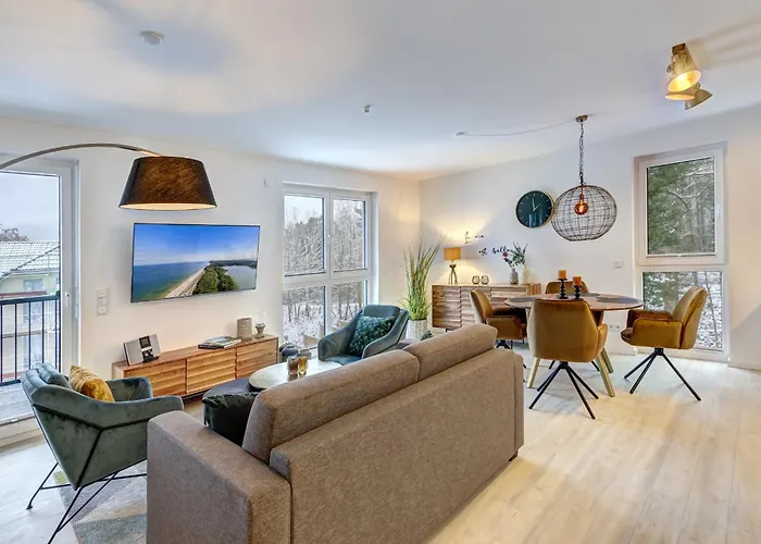 O apartamento Bernsteinquartier Bq0556 Meeresgold está localizado a 1 km do centro de Kölpinsee e oferece acomodação com parque de estacionamento no local. Este apartamento inclui kitchenette com forno, aparelhos de cozinha e peças de vidro.